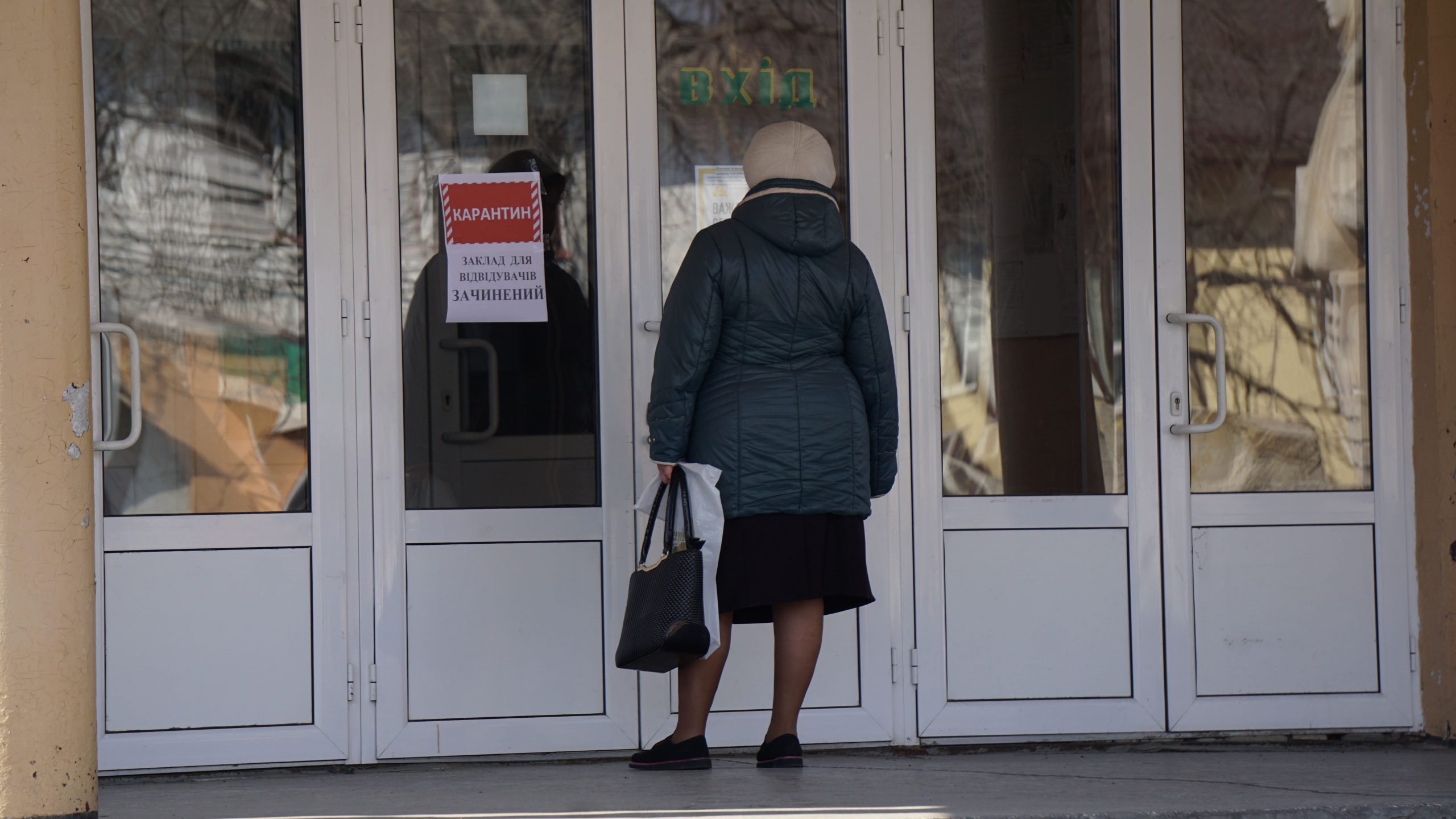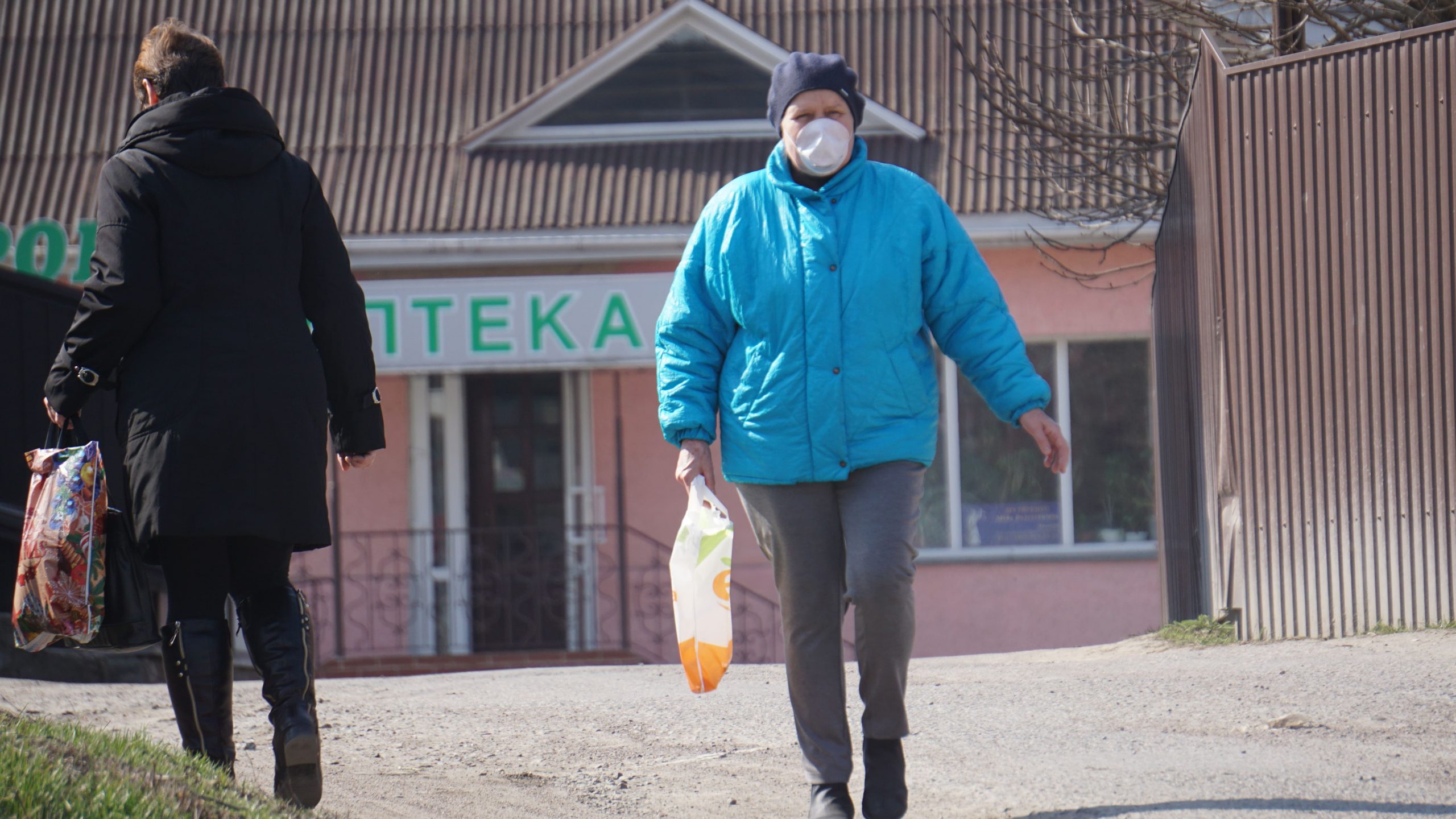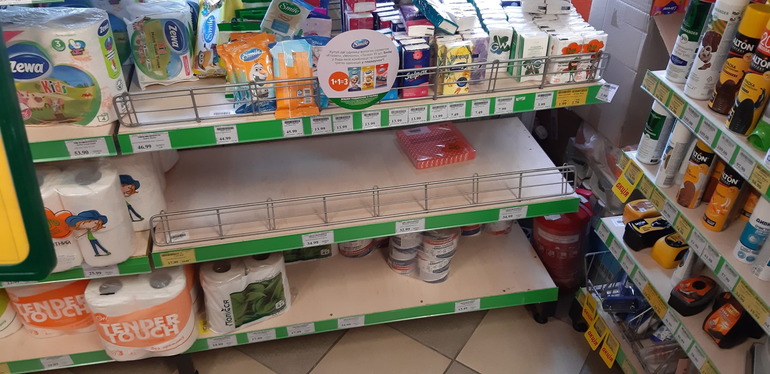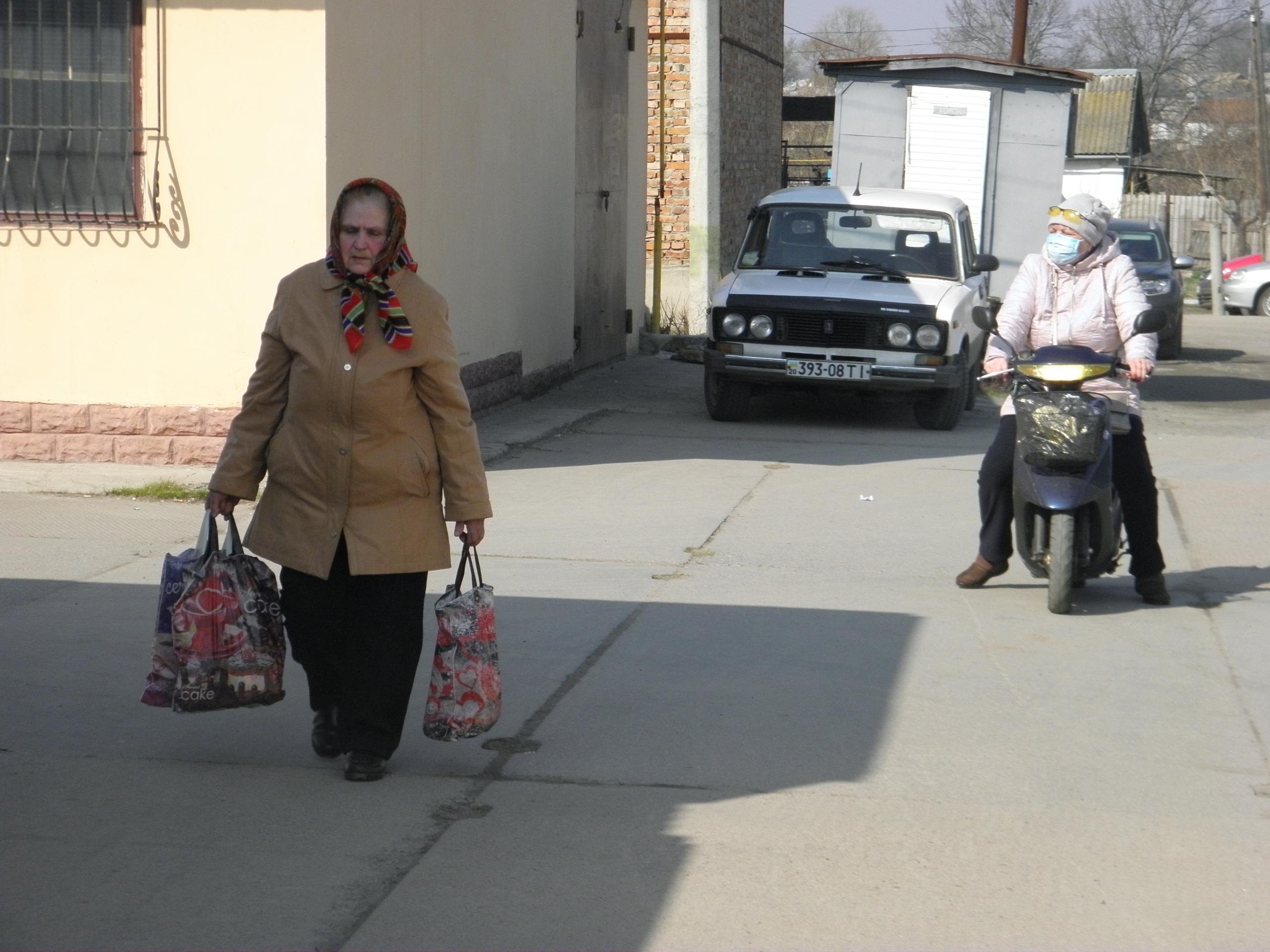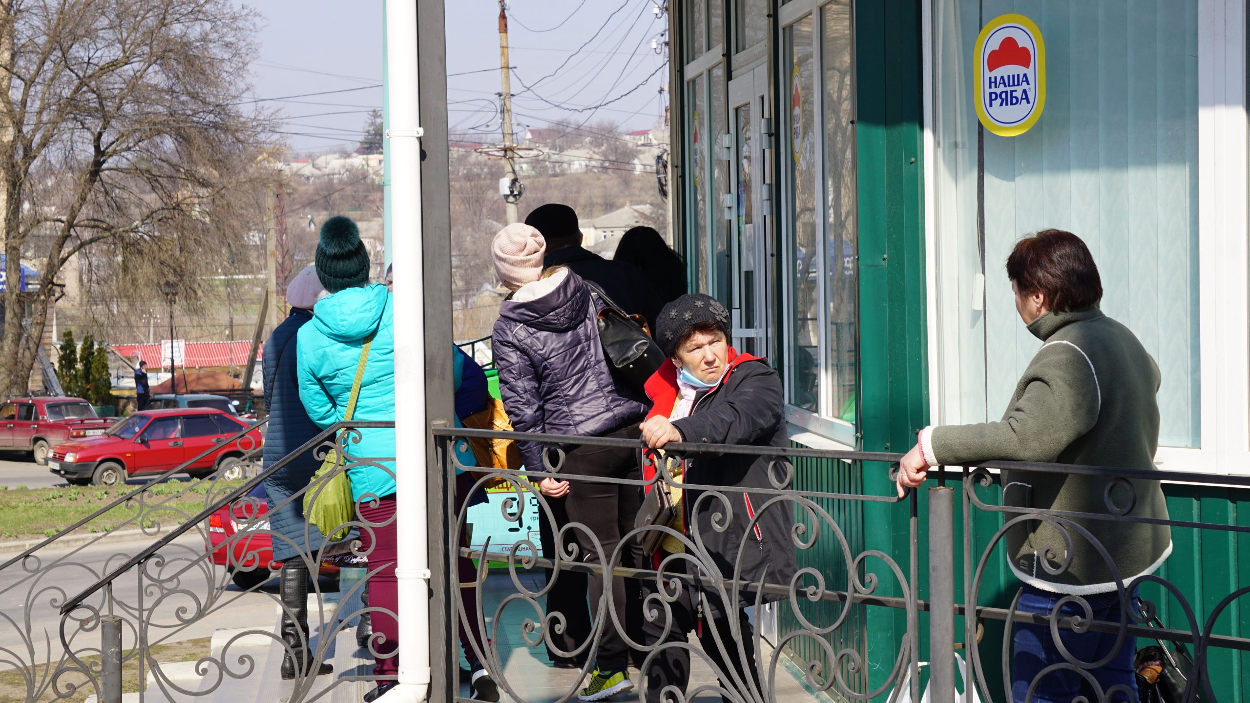 Прямуємо до відділення пошти. Неподалік нього стоять двоє чоловіків, про щось активно говорять, сміються. На вхідних дверях – інструктаж, як вберегтися від поширення коронавірусу, як дотримуватися дистанції. На підлозі біля віконечок обслуговування – жовті мітки, аби люди не заходили за них і, таким чином, була дотримана дистанція. Таке прохання надрукували та повісили на кожному з віконечок. Будинок культури також зачинений. Якась жіночка підходить, смикає двері – закрито. У магазині «Єва» налічуємо чоловік з десять, не більше. Продавчині одягли маски, інші працівники, що розкладають товар на полицях, теж з масками. Саме роблять викладку пральних порошків та іншої побутової хімії. У магазині поріділи полиці із серветками та туалетним папером. У «АТБ», що навпроти, просто так ще з учорашнього вечора не зайдеш. Під дверима – черга з кількох людей. Кажуть, що охоронці пускають так, аби у торговому залі було одночасно не більше 10-ти людей. Тому люди чекають, поки хтось не вийде назовні. Коли до нас черга майже дійшла, до магазину, як поперед батька в пекло, влетів якийсь чоловік. Хотів, було, заскочити всередину без черги, але, побачивши охоронців у масках, рвонув назад. Надворі довго скаржився: на ці черги, на кількість людей і на владу: «Чому пускають тільки по 10? Чому не по 5, 3? Краще по 1-му запускати! Хто ці закони придумав?» Нарешті до «АТБ» потрапляємо і ми. У залі на полицях є все, окрім м’яса. Хліба також вдосталь. Дещо «підчистили» полиці з макаронами, цукром, сіллю, крупами (особливо гречкою). Дві жіночки набирають у торбинку яйця з лотків. Біля полиць з побутовою хімією немає нікого, люди йдуть переважно за продуктами.