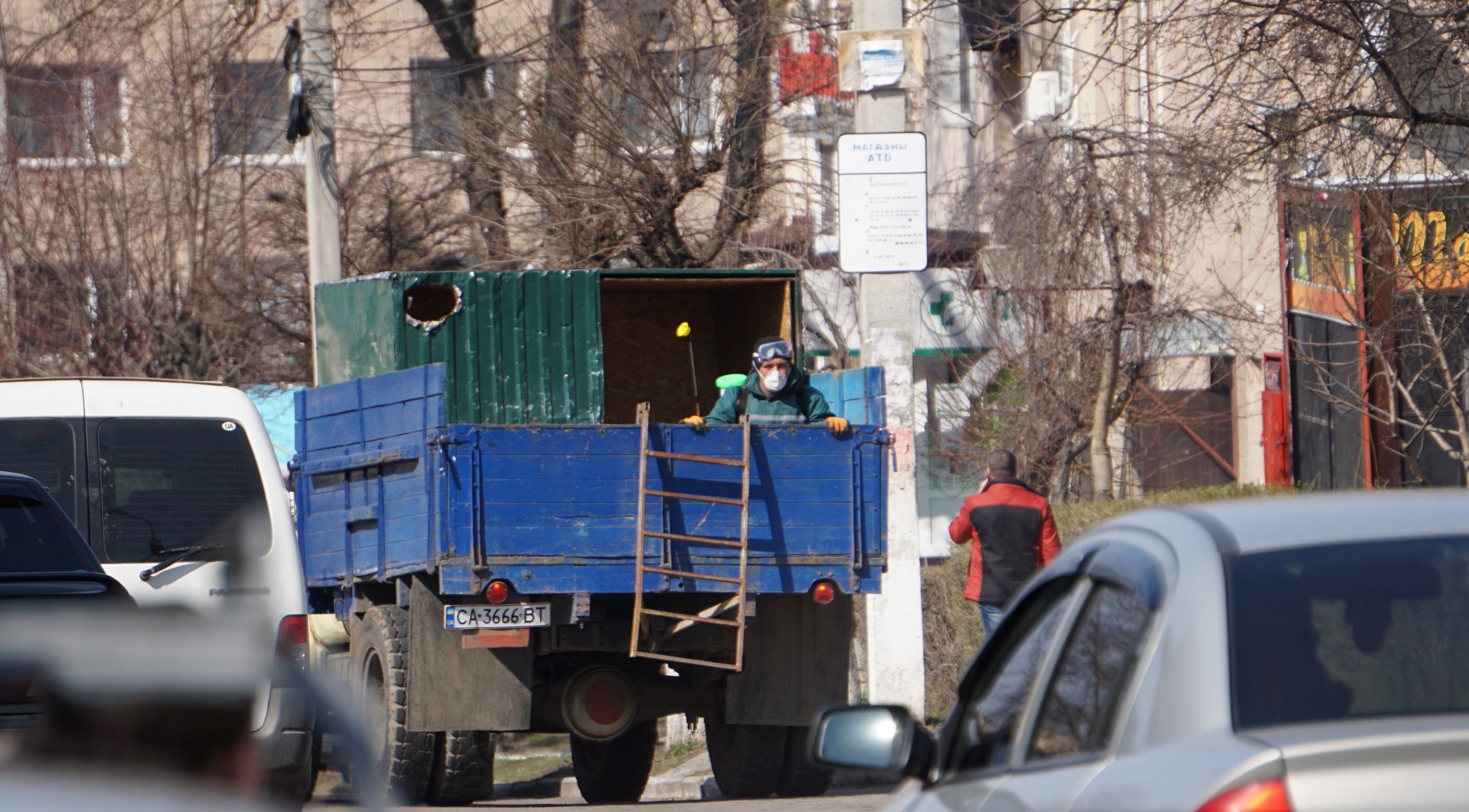 Біля «АТБ» на тротуарі прямо на землі у ящиках стоять яблука. Продає їх якийсь чоловік. Трохи далі працює квітковий магазин, а через дорогу – «Флора» – зачинений. На зупинці сидять люди, певно, чекають на автобус. І таки він приїжджає! Тим часом, усі зупинки обробляє деззасобами із оприскувача чоловік у спецодязі, з маскою на обличчі та в рукавичках. Об’їжджають усі зупинки на вантажівці. Переважна більшість продуктових магазинів працює: «Ярмолино», «Наша Ряба» (в першій половині дня тут зібралася чимала черга, також заходити можна не більше, як 10 особам), «Українські ковбаси», біля школи №2 відкритий супермаркет «Крафт», працюють також аптеки, не закрився на карантин і магазин побутової техніки Торговий дім «Тальне».