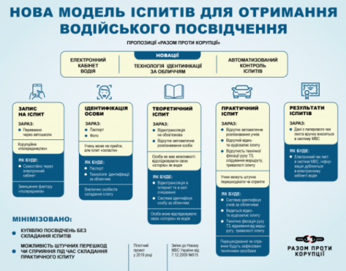 Концепцію нового формату водійських іспитів розробили антикорупціонери, експерти з IT-сфери та фахівці Головного сервісного центру МВС на основі світового досвіду. За її допомогою не лише планують спростити доступ до отримання водійських посвідчень, але й мінімізувати корупцію у цій сфері. Нову модель автоіспитів презентували урядово-громадська ініціатива “Разом проти корупції” спільно із ГО “Асоціація українських моніторів дотримання прав людини в діяльності правоохоронних органів”.