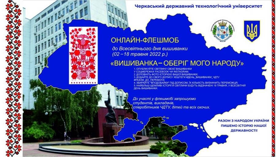 Відділ студентського розвитку та культурних програм Черкаського державного технологічного університету запрошує усіх охочих долучитись до онлайн-флешмобу «Вишиванка – оберіг мого народу», присвяченого Всесвітньому дню вишиванки, який цьогоріч припадає на 19 травня. Така раптівка покликана не лише спонукати до збереження народних традицій, популяризації етнічного одягу українців, а й підтримати патріотичний дух у непрості часи, коли Україна протистоїть російському агресору.