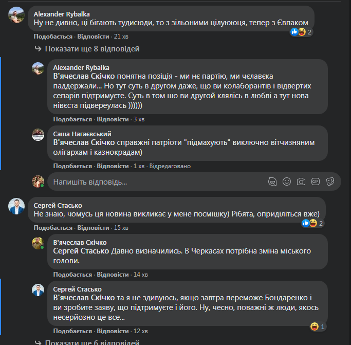 Між тим у Черкасах про всі ці заявлені принципи, схоже, забуто, бо всі три сили об’єднались у таку собі “широку коаліцію” – “ширку” – як колись намагались Блок Юлії Тимошенко з Партією регіонів у парламенті при Президенті Ющенку. З того нічого не вийшло, звісно, але, як-то кажуть, осад залишився, бо зрадженими довго почувались прихильники обох протилежних політичних таборів.