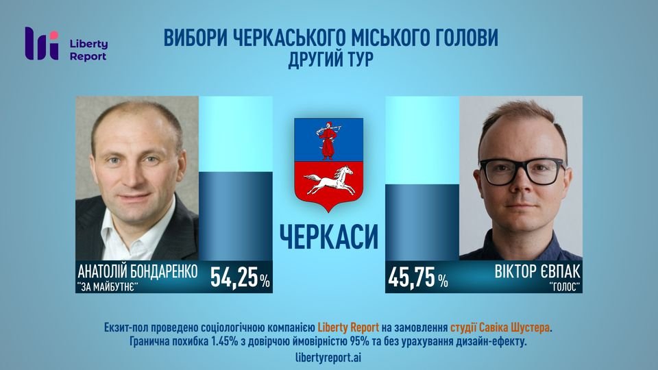 Стали відомі результати екзит-полу другого туру виборів міського голови міста Черкаси, проведеного соціологічною компанією Liberty Report на замовлення студії Савіка Шустера.