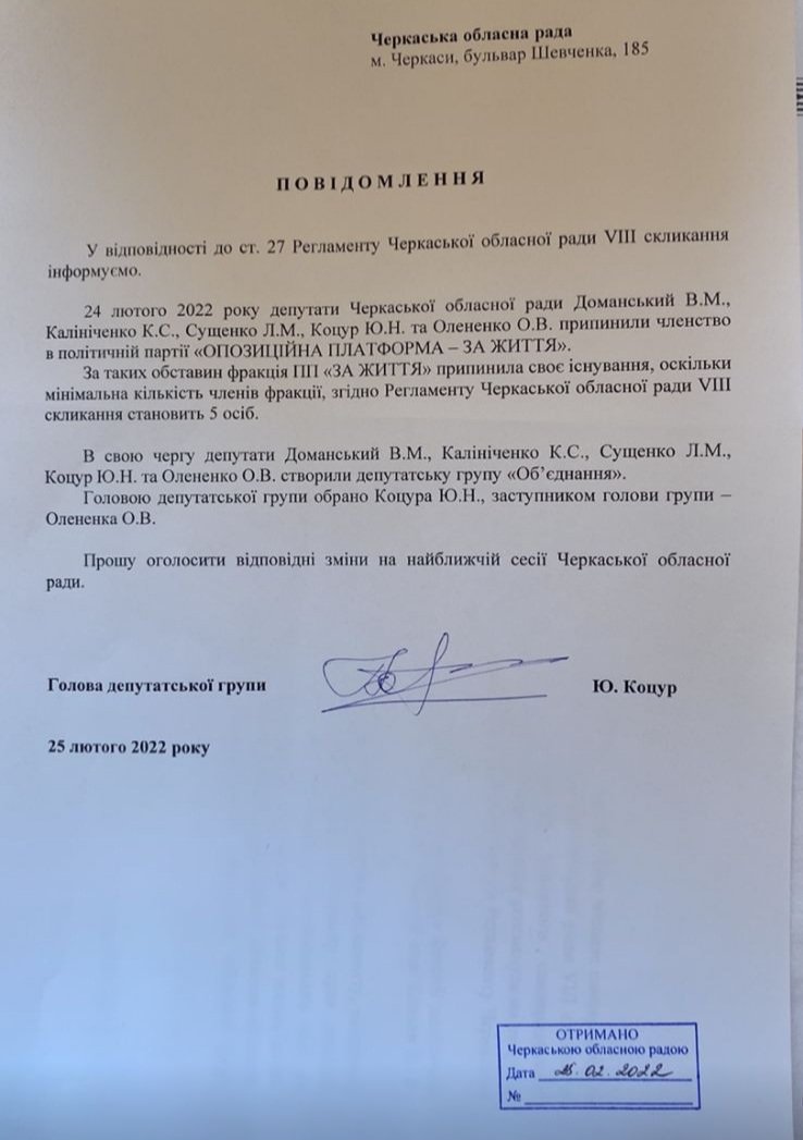 За таких обставин ця політична партія припинить своє існування в Черкаській облраді, адже за Регламентом у фракції має бути хоча б 5 осіб.
