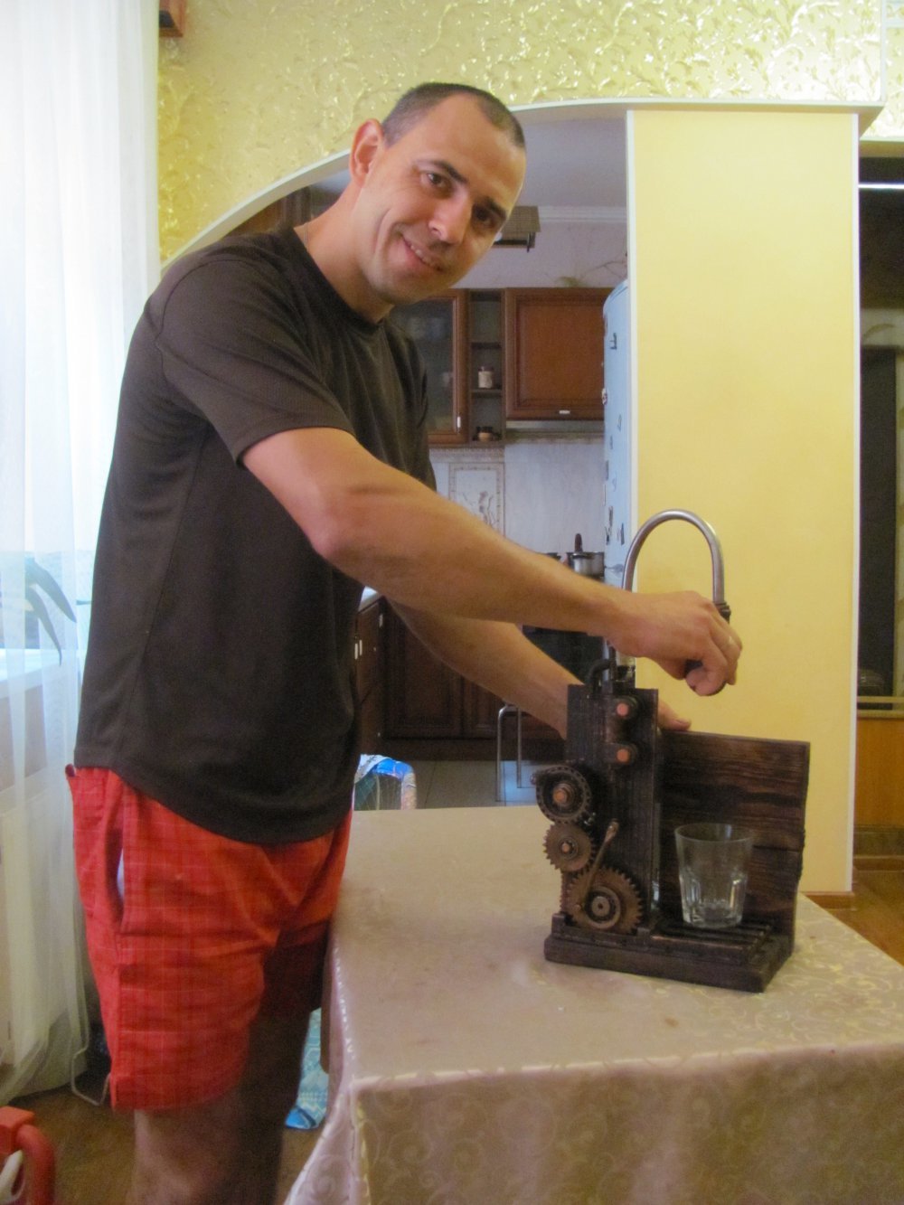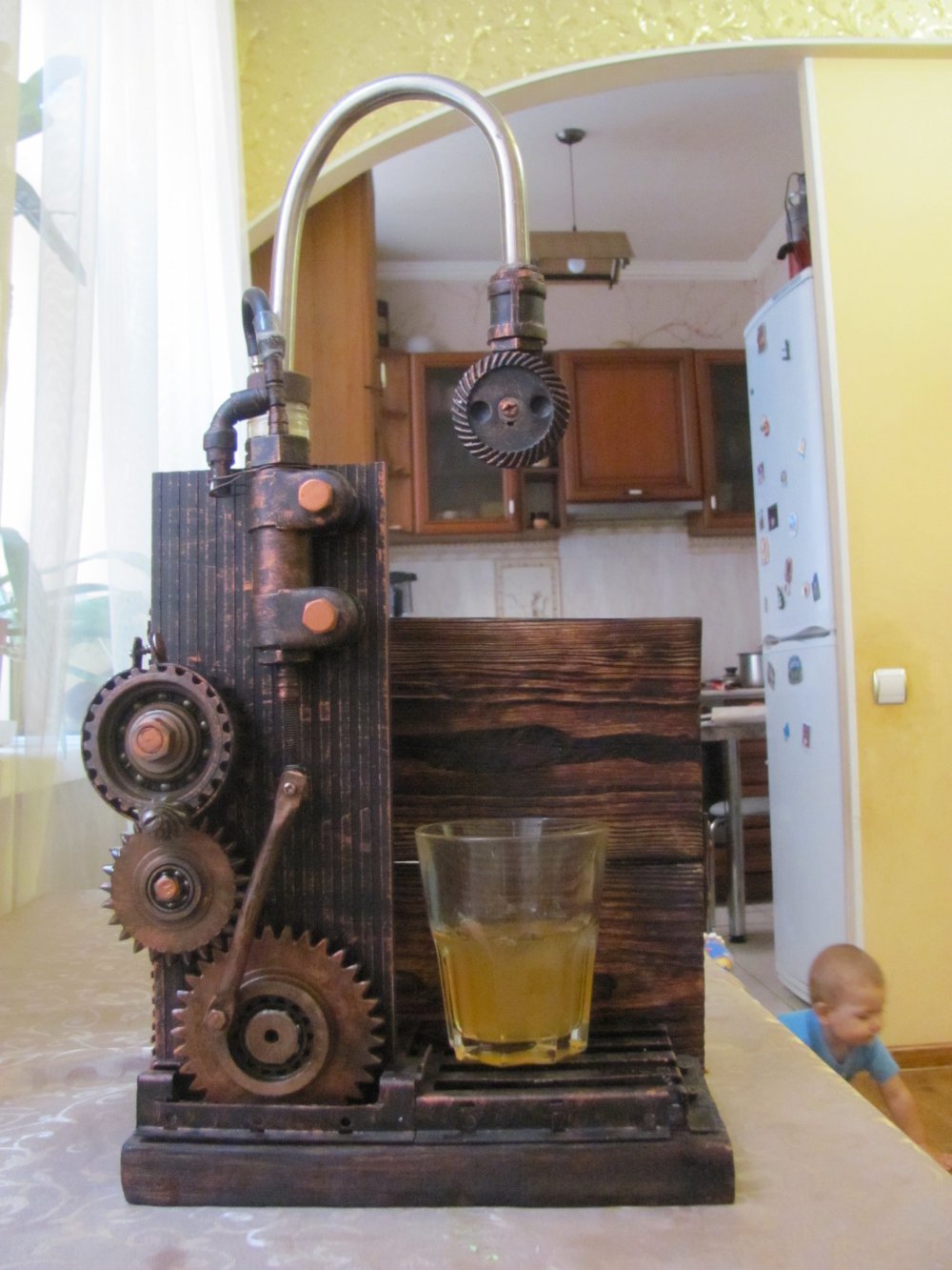 Оскільки я працював барменом, різних пляшок у мене вистачає. Взяв пляшку і думаєш, що там треба додати якихось трубочок, а там ланцюг від автомобіля. Крім кальянів, роблю ще ліхтарі. Також диспенсери для алкоголю. Їх призначення – ефектно наливати алкоголь. Диспенсер складається зі штучно зістареного дуба, шестерень, кранів, елементів корпусу від комп’ютера. Насос закачує повітря в пляшку, і воно вже видавлює рідину.