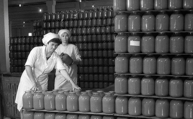 На фото: промислова консервація у Леськах, сифони і електрочайники Машбуду (фото Ігната Діамента), «черкаські» етикетки.