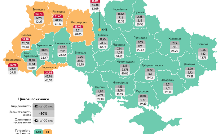 «У нас є декілька областей, які перевищують показник інцидентності 12 на 100 тисяч населення. Зокрема, це м. Київ, Волинська, Житомирська, Закарпатська, Львівська, Рівненська та Чернівецька області. Ці області не можуть застосувати пом’якшення карантинних заходів», – прокоментував Головний державний санітарний лікар України.