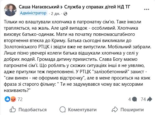 У Новодмитрівській громаді, що на Золотоніщині, мобілізували 38-річного чоловіка, який сам виховує малолітнього сина. Чоловіка затримали, коли він прийшов у ТЦК, отримавши повістку. Відстрочку він не встиг оформити. Про це виданню “Про все” повідомив начальник Служби у справах дітей новодмитрівської громади Олександр Нагаєвський.