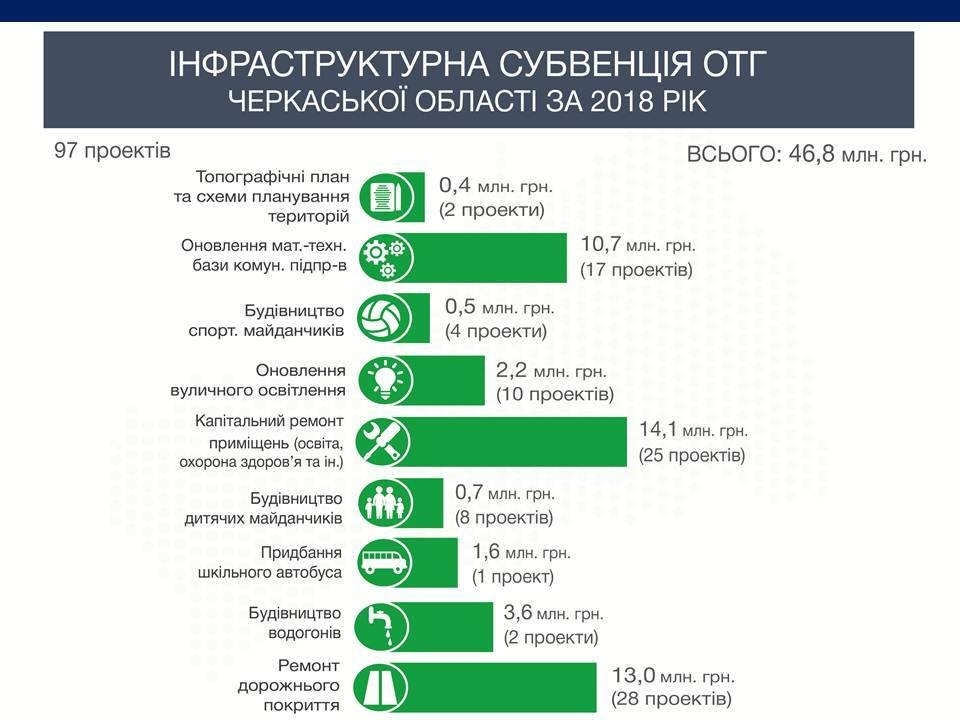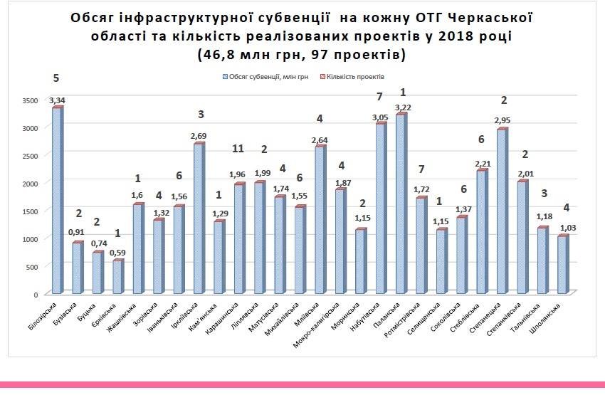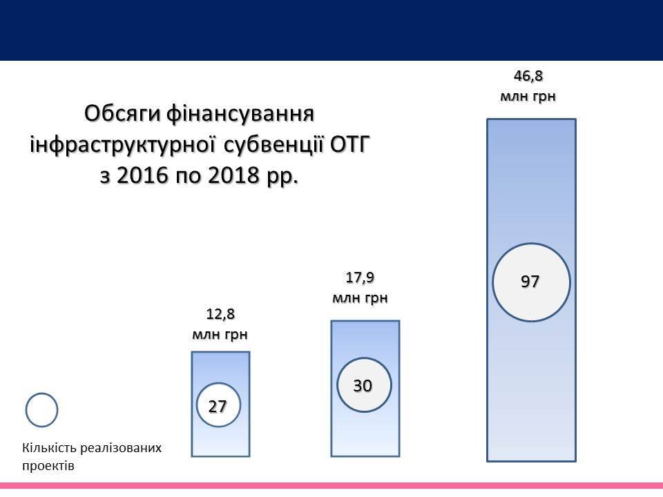 Держава продовжує надавати фінансову підтримку на формування інфраструктури об’єднаних територіальних громад. Так у 2018 році з державного бюджету 26 ОТГ області отримали 46,8 млн грн. За ці кошти вони реалізували 97 проектів.