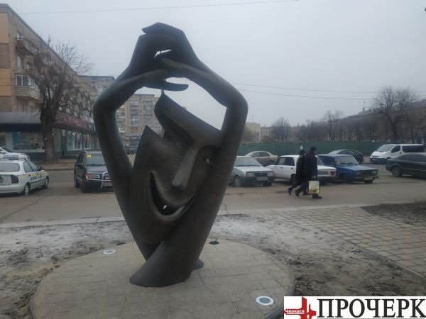 У Черкасах перед театром, який вже майже-майже відремонтували, поставили скульптуру. Вона викликала неоднозначне сприйняття. Справа в тім, що скульптура має дві сторони: з одного боку маска, яка всміхається, з іншого – сумує.