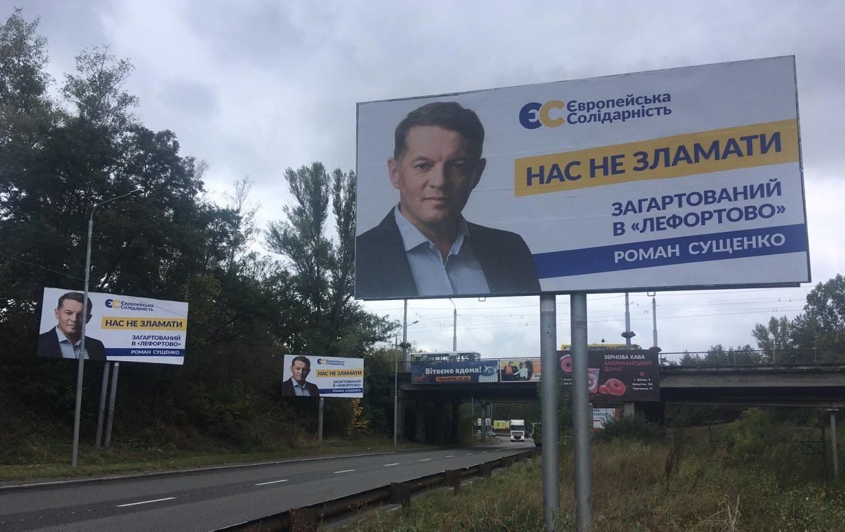 Білборди із агітаційними меседжами оформлені з використанням символіки і логотипу політичної партії “Європейська Солідарність” та містять зображення, прізвище та ім’я кандидата. А також написи  “Нас не зламати Загартований в “Лефортово” Роман Сущенко”.