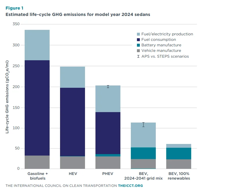 Fuel/electricity production означає викиди та вплив на довкілля, пов’язані не з роботою автомобіля, а з виробництвом пального чи електроенергії, якою він користується. Fuel consumption — кількість енергії або пального, яку автомобіль споживає під час експлуатації. Battery manufacture — вплив на довкілля від виробництва акумулятора. Vehicle manufacture — вплив на довкілля від виробництва автомобіля.