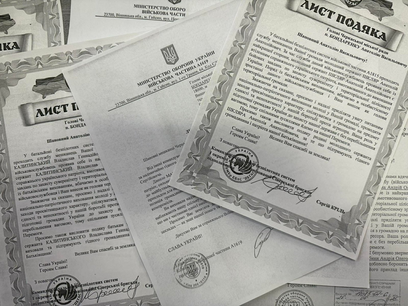 Ще одним доказом цього стали листи-подяки родинам захисників від командування різних військових частин, де служать наші земляки. Такі подячні листи надходять і на адресу Черкаської міської ради, зокрема, мера Анатолія Бондаренка. Командири військових частин звертаються до міської громади із словами вдячності за гідних синів черкаської землі. У кожному такому листі наголошується, що наші воїни-земляки проявляють себе, як справжні патріоти, сильні духом, рішучі, вольові та віддані своїй справі. Кожен з них є гідним прикладом для наслідування. Любов до Батьківщини для наших бійців, то не просто слова, а свідома позиція, де немає компромісів у питанні відстоювання незалежності Української держави.