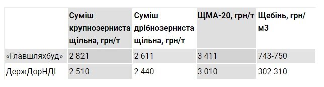 Згідно з протоколом узгодження цін на матеріальні ресурси, асфальтобетон щільний дрібнозернистий тип Б марка 1 обійдеться в 2 611 грн/т, а той же асфальтобетон на бітумах з адгезійними добавками — 2 801 грн/т. Асфальтобетон щільний крупнозернистий тип А марка 1 на бітумах БНД 60/90 коштуватиме 2 821 грн/т, а ЩМА-20 на бітумі БМКП  —  3411 грн/т.