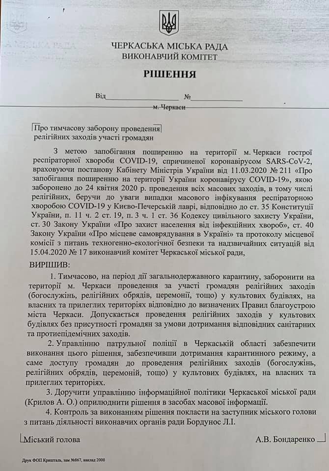 “Тимчасово на період дії загальнодержавного карантину, заборонити на території м. Черкаси проведення за участі громадян релігійних заходів у культових будівлях,на власних та прилеглих територіях та на території міста Черкаси. Управлінню патрульної поліції в Черкаській області забезпечити виконання цього рішення”, – йдеться в документі.