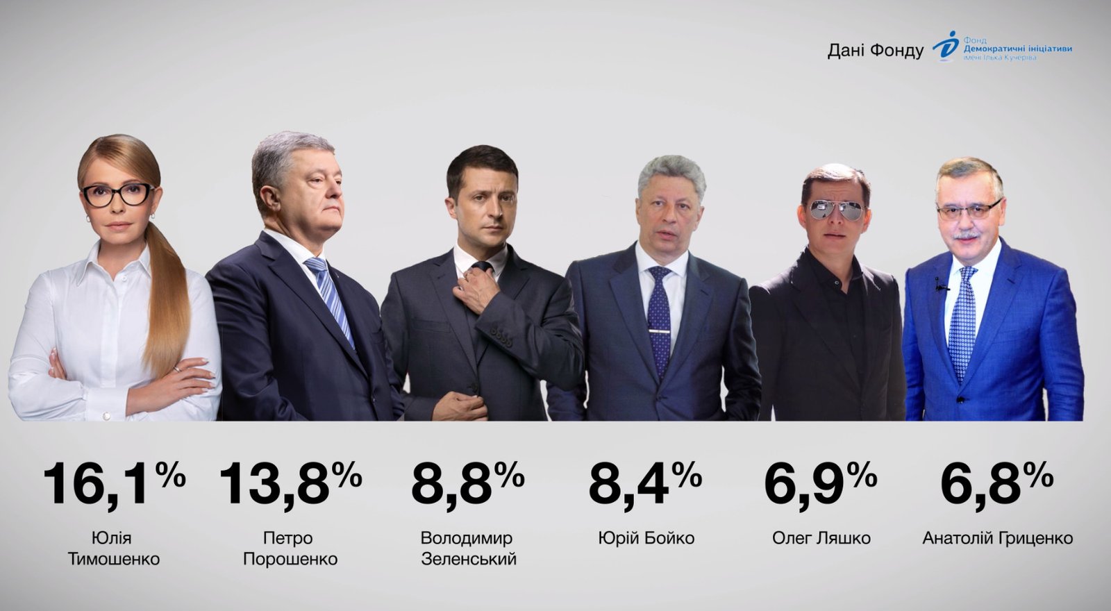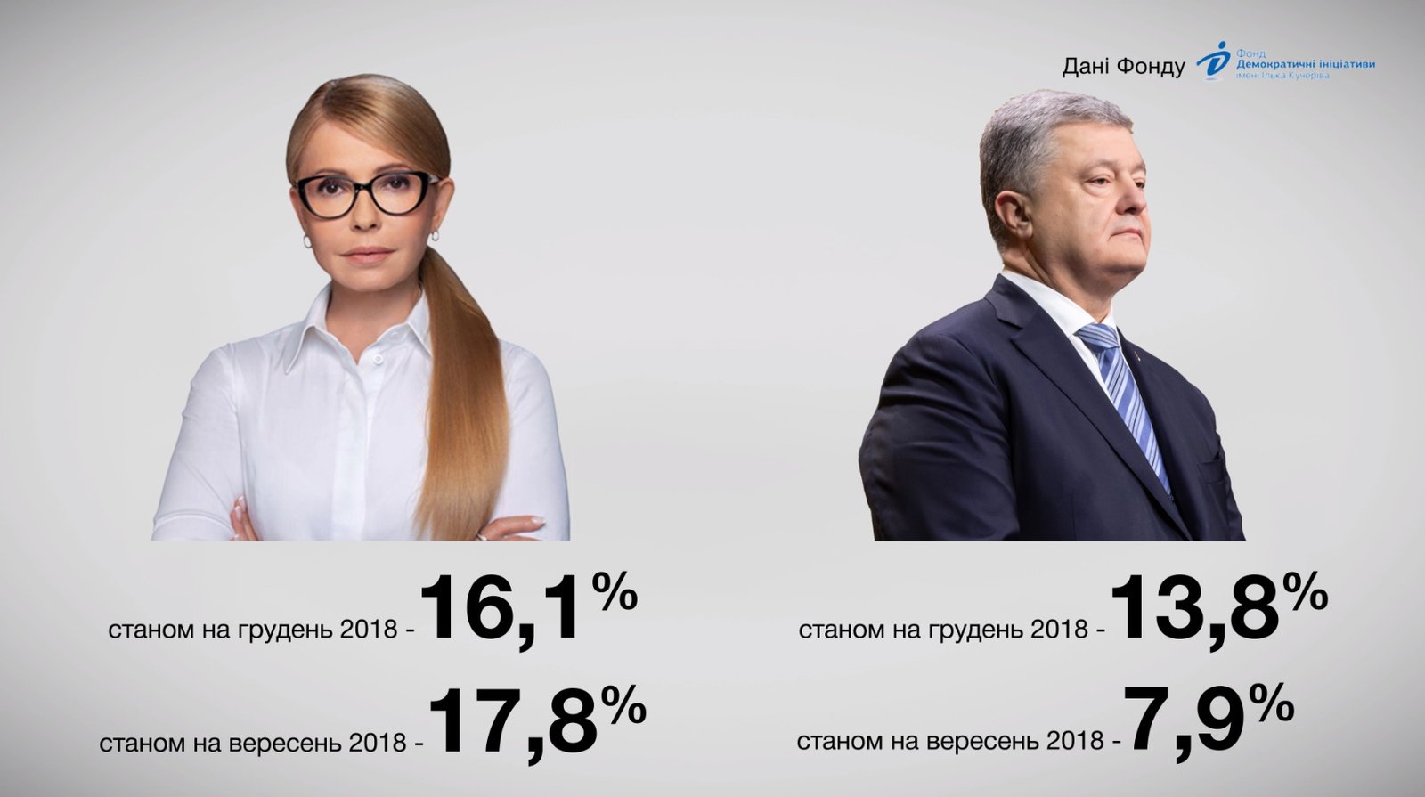Так, станом на грудень 2018 року Юлію Тимошенко підтримують понад 16% українців, чинного Президента Петра Порошенка – майже 14%. На третьому місці – шоумен Володимир Зеленський із рейтингом у 8,8%. Майже впритул до нього – Юрій Бойко. Його підтримують 8,4% українців. По майже 7% – у Олега Ляшка й Анатолія Гриценка.