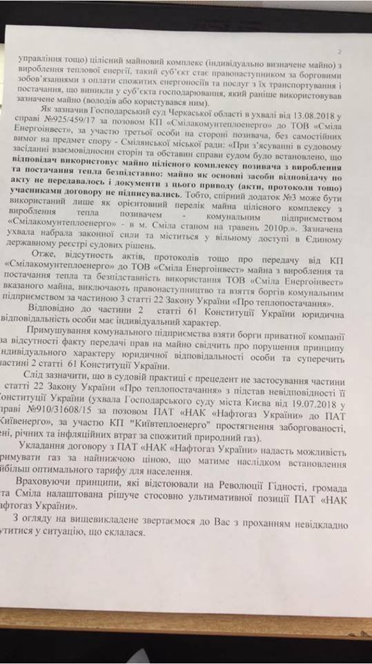 “Слід зазначити, що міська рада не була стороною договорів ТОВ “Сміла Енергоінвест” з ПАТ “НАК Нафтогаз Украни”, дозволів на їх укладання не надавала, гарантом виконання зобов’язань не виступала, а тому їй невідомі причини неналежного виконання або невиконання зобов’язань ТОВ “Сміла Енергоінвест”, – йдеться у зверненні.