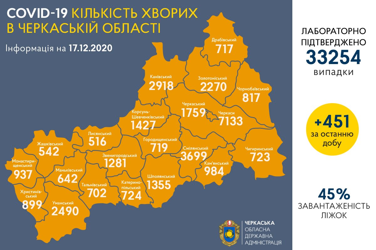 +451 новий випадок коронавірусної інфекції виявили шістнадцятого грудня на Черкащині. З початку пандемії усього підтверджених випадків – 33 254. Про це повідомляє очільник області Сергій Сергійчук.