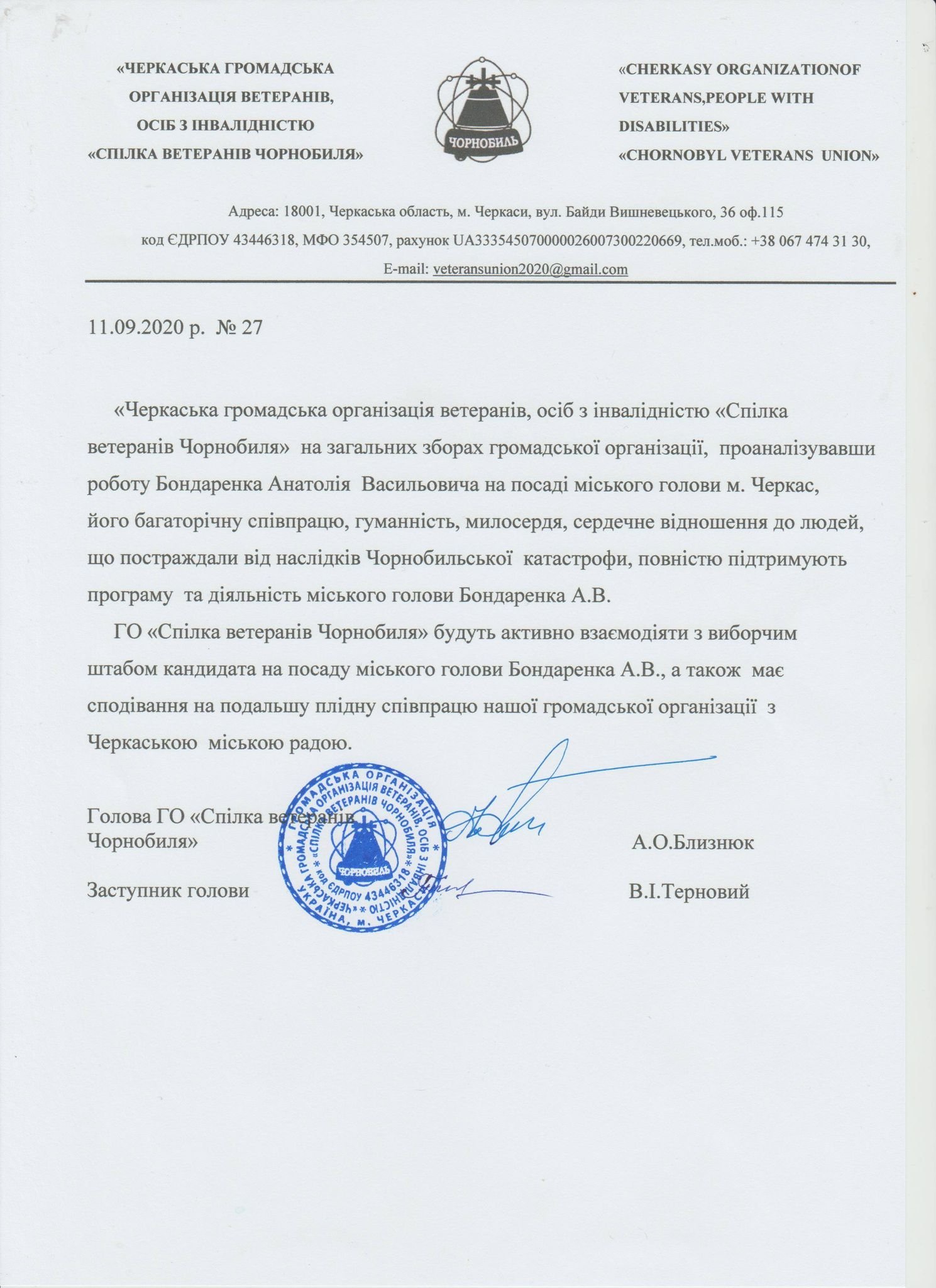 Черкаська громадська організація ветеранів, осіб з інвалідністю «Спілка ветеранів Чорнобиля» на загальних зборах громадської організації підтримують Анатолія Бондаренка на виборах міського голови Черкас, які відбудуться 22 листопада.