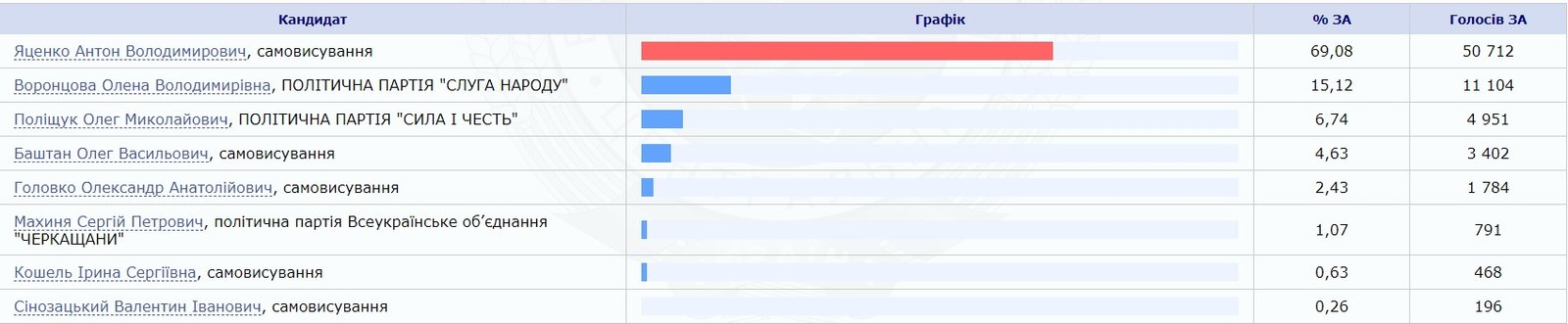 Центральна виборча комісія опрацювала 100% протоколів на окрузі №200 (Умань, Христинівка, Монастирище). Тут із величезним відривом від конкурентів переміг Антон Яценко, по факту, набравши уп’ятеро більше голосів, ніж висуванка від “Слуги народу” Олена Воронцова. Таким чином Яценко як мажоритарник отримав найвищу підтримку серед мажоритарників по всій Україні.