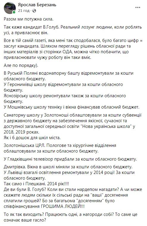 Санаторну школу у Золотоноші облаштовували за кошти субвенції з державного бюджету… у 2018, 2019 роках. Як і 6 дощок для шкіл міста. Золотоніська ЦРЛ. Пологове та хірургічне відділення облаштовували за кошти обласного бюджету. У Гладківщині телевізор придбали за кошти обласного бюджету. Дмитрівка. Вікна в школі міняли за кошти обласного бюджету. У Львівці взагалі освітлення ремонтували у 2014 році! За кошти обласного бюджету. Так само і Плешкані. 2014 рік!!!! Де ви були В. Голуб? Коли ви стали нардепом нагадати?, – йдеться у тексті.