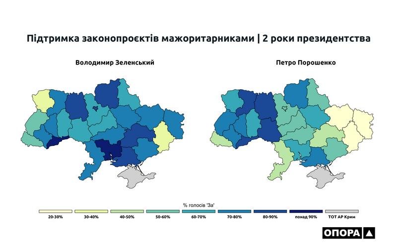 Якщо порівнювати ці показники із Петром Порошенком, то найактивніше підтримували його законодавчі ініціативи Житомирська (86,4%), Чернівецька (85,4%) та Вінницька (83,7%) області. Натомість найменший рівень підтримки продемонстрували Донеччина (28,3%), Луганщина (27,2%) та Харківщина (24,2%).