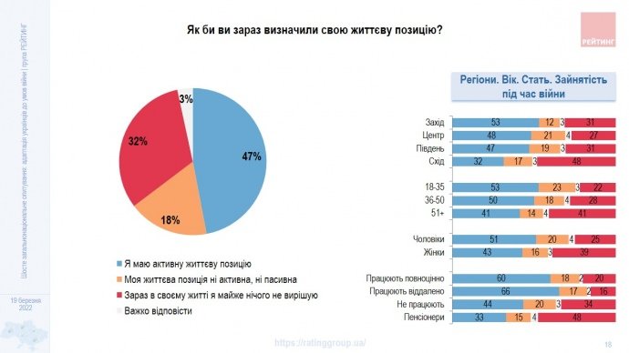 Найбільш активна життєва позиція зберігається у молоді, чоловіки також більш проактивні, ніж жінки.