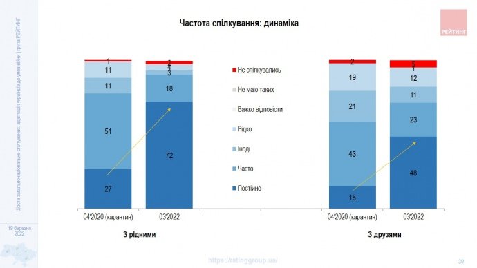 Частка тих, хто постійно на зв’язку із рідними, зросла втричі порівняно з квітнем 2020 року. Це так само стосується спілкування з друзями.