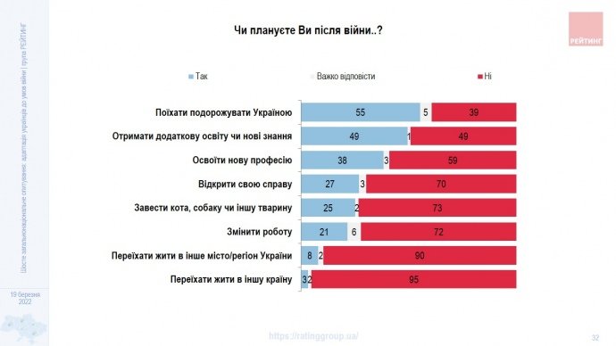 Лише 5% хочуть після війни переїхати в іншу країну і 10% – в інше місто. Майже всі хочуть або залишитися вдома або повернутися додому.