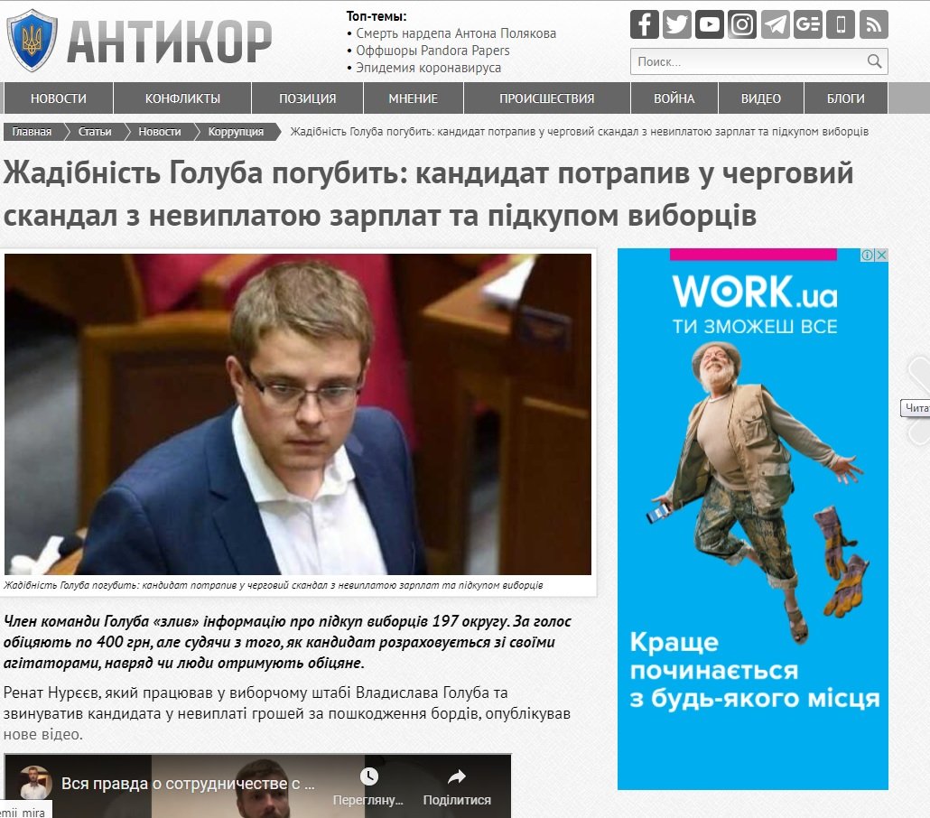 Видання передає слова Рената Нурєєва, який начебто працював у виборчому штабі Владислава Голуба та звинуватив кандидата у невиплаті грошей за пошкодження бордів. Чоловік опублікував нове відео-викриття.